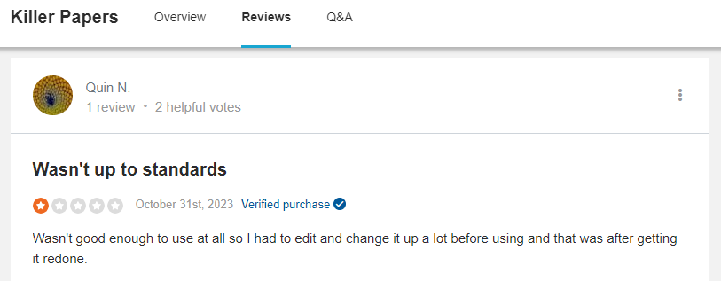 Is Killer Papers reliable? Let’s find out. I’ve spent considerable time analyzing the online reputation of Killerpapers across multiple online review platforms like Trustpilot, Sitejabber, and even Reddit. The company has a mixed reputation, with some praising their paper writing services while others highlighting significant issues, especially regarding the quality of writing. For instance, one reviewer mentioned that the paper they received "wasn’t good enough to use" and required significant editing before it was usable.