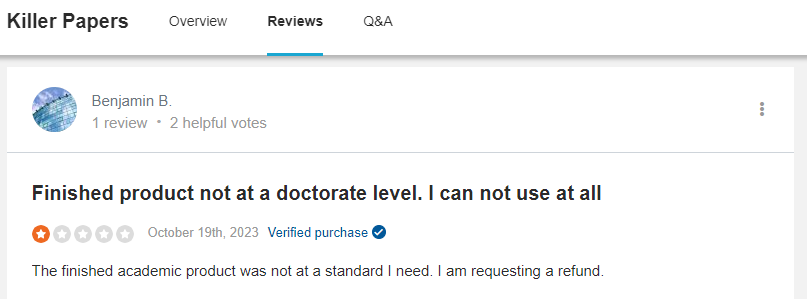 So, is Killer Papers safe? Well, it’s complicated. Another customer, who ordered a doctorate-level paper, was deeply disappointed by the low quality, claiming the work wasn’t even close to the academic standards they expected and that it seemed like non-native English speakers wrote it. They even went so far as to request a refund.