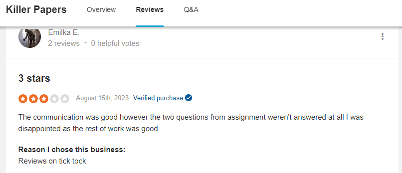 Not the best customer reviews, right? Finally, another customer gave a three-star review, mentioning that while communication was decent, their assignment had two unanswered questions, ultimately affecting their satisfaction. The recurring issues surrounding the quality of writing and missed expectations seem to be common complaints. Not the best Killerpapers reviews, right?