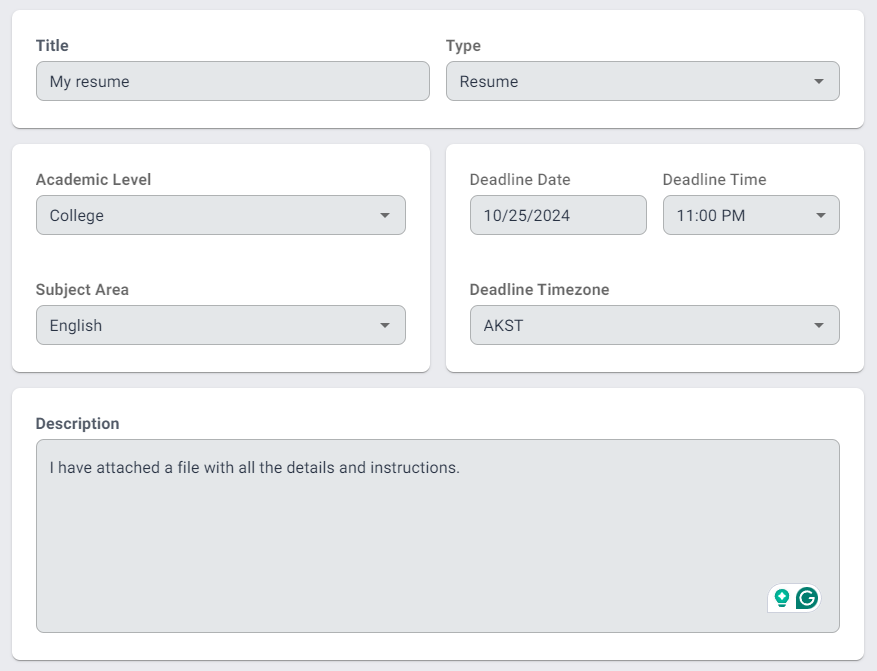 Here is another part of my Killer Papers review. To begin ordering on Killerpapers, beginners need to click the "Order" button on the start page, which takes them to the order form. The process requires filling out various parameters, such as the type of assignment, academic level, and deadline. In my case, I ordered a resume. After entering the details, I was prompted to log in or create a new account.