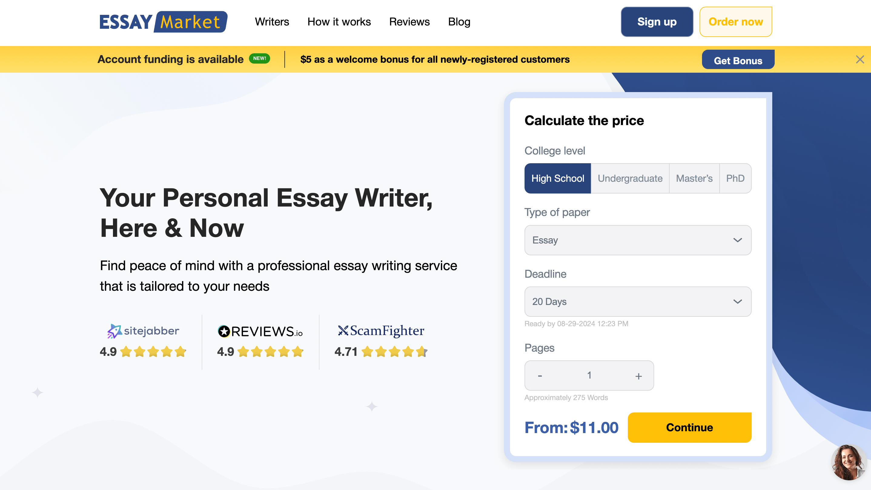 What is the first and the most peculiar feature of the Essaymarket.net service to emphasize? An opportunity to choose a scholarship writer and the price of an order. As the company uses a bidding system, the students have to place an order first and then start getting quotes from various writers ready to accomplish the project. How safe is the experience? A lot of new customers feel confused and puzzled, as they know nothing about the writers, and the choice may be complicated. Nonetheless, after you place the first order at the scholarship essay writing service, you will be 100% sure the result is worth the effort.