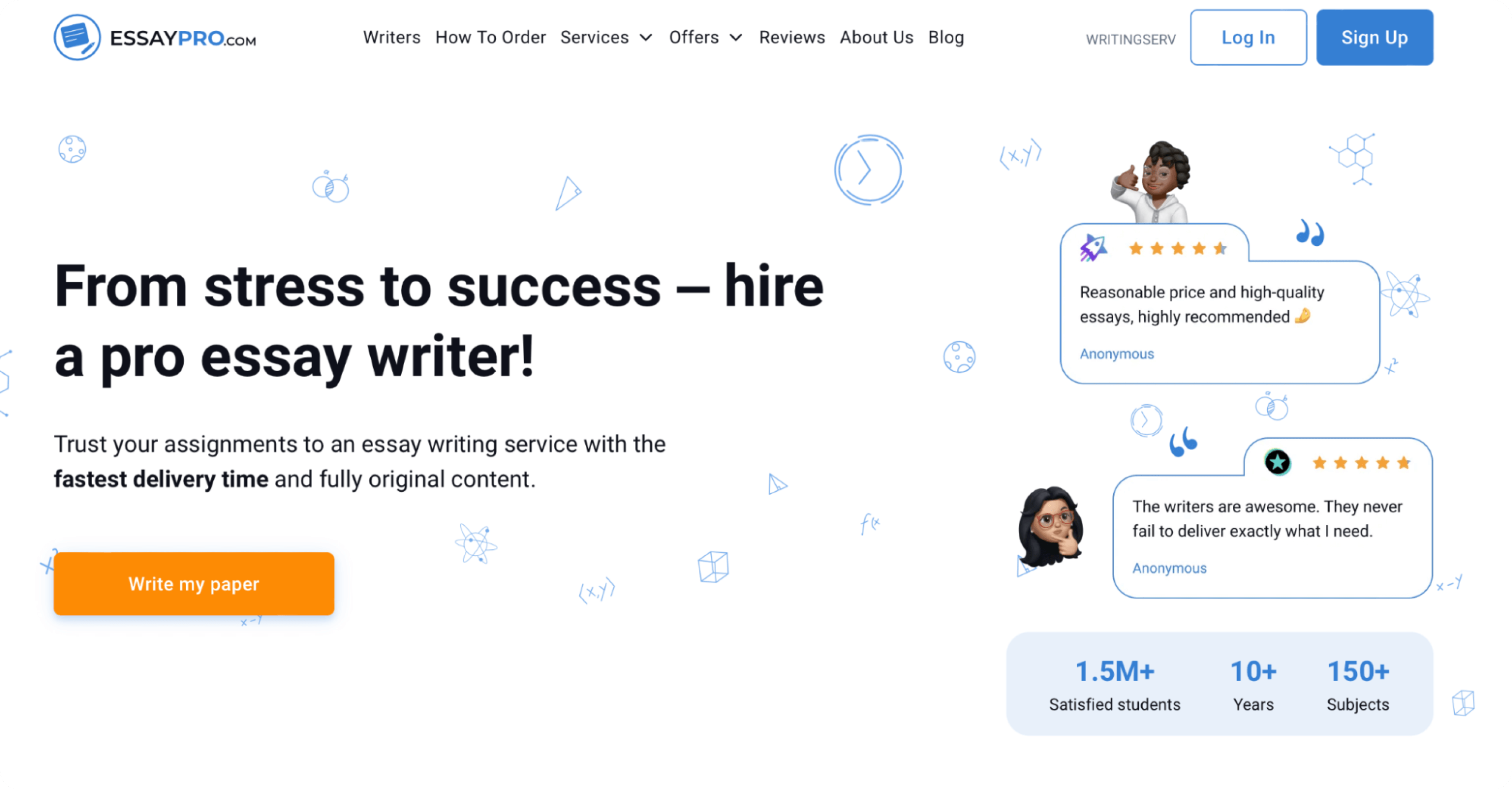 Even though the competition on the market of the online essay writing platforms is harsh, EssayPro.com is the company that stands out. Unique bidding system offers the maximum flexibility of the provided services and their costs, while the modern encryption system guarantees the safety and anonymity of the experience.