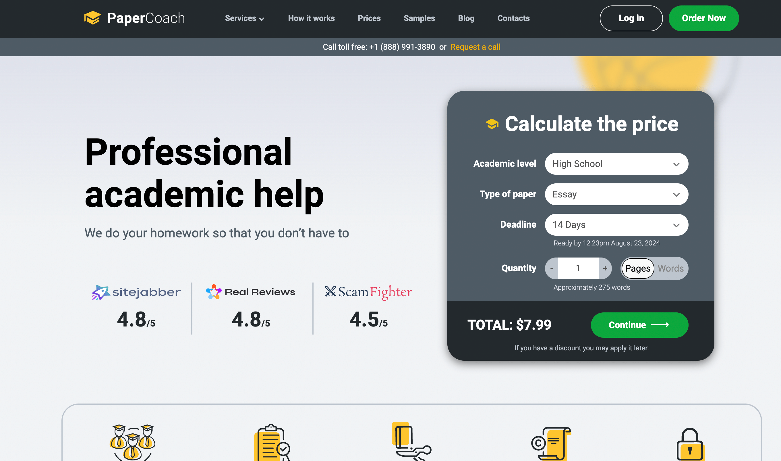 Browsing the page of the PaperCoach.net as a potential scholarship essay writing service to rely on, students can notice a great number of advantages and features that will not leave them indifferent. Easy-to-navigate website with the online price calculator, contacts of the support team, and reviews of previous customers makes learners keep analyzing the available solutions.