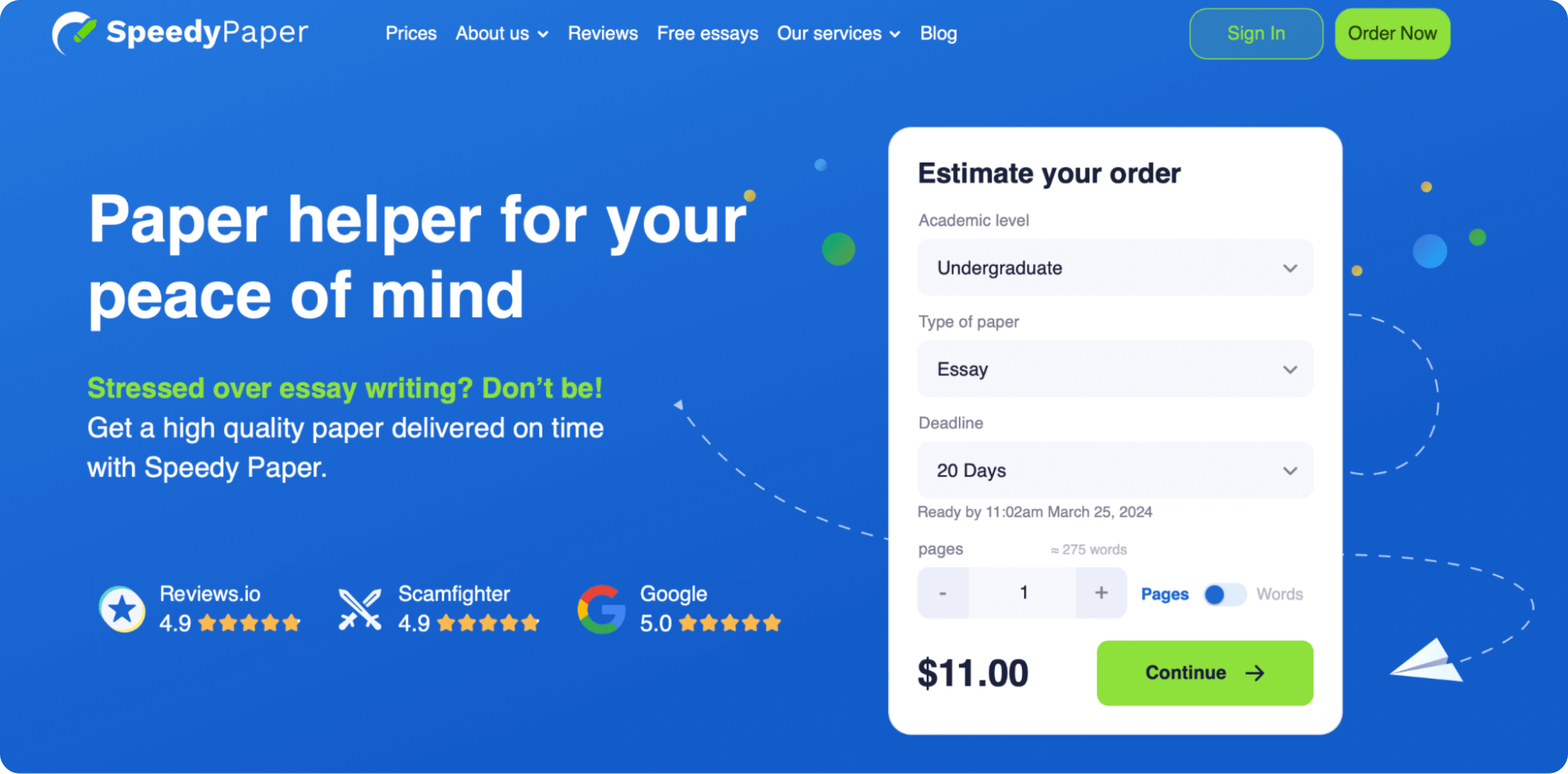 Online price calculator is the first thing you will notice on the SpeedyPaper.com page. An opportunity to estimate the cost of the project add to the transparency of the services, which is critical for learners.